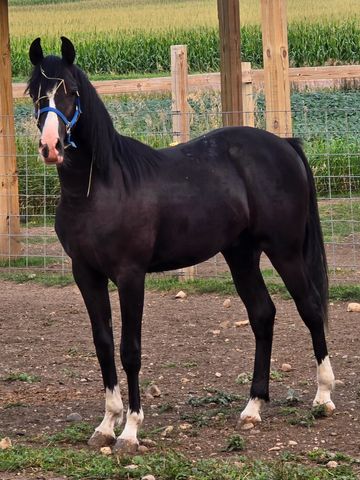 Purebred black with chrome registered Arabian colt. Quiet and easy going, correct and eye-catching, never in a huge hurry, and not a mean bone in his body. He's got it all going on in a package that everyone dreams of.